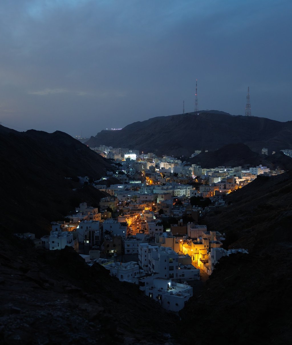 The city scape, and indeed architecture, throughout Oman is interesting. Whereas many of its neighbouring countries have embraced skyscrapers and modern finishes, Oman has determined to retain its traditional architectural asthetic. Hence you will find low rise buildings finished in white, ivory or beige. The sunset viewpoint we went to shows this clearly, and also the general terrain with the city nestling in the foothills of the mountains.