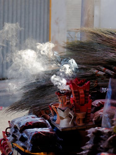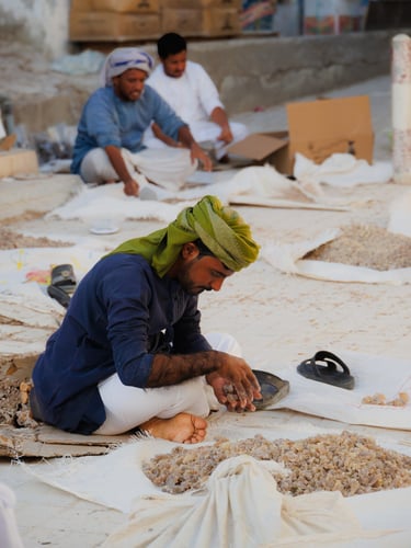 Muttrah Souq is a bustling area of Muscat, seemingly dominated by jewelry shops, but with plenty of spice, fabric and handicraft stalls. My enduring memory, apart from the mountains, is the smell of frankincense everywhere. If they are not burning it, they are chopping it up in order to burn it. It is harvested from the wild Boswellia sacra trees in the Dhofar region of Oman by making incisions in the tree bark and then letting the sap that flows harden.