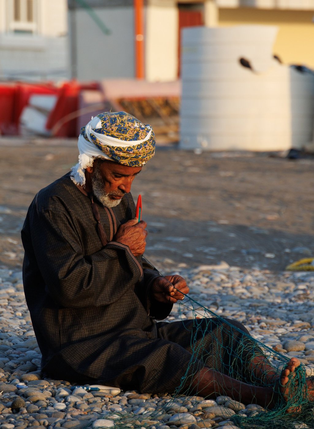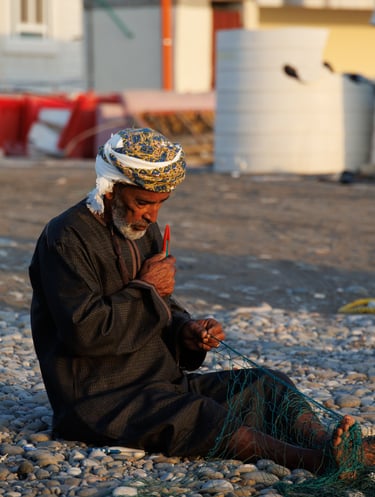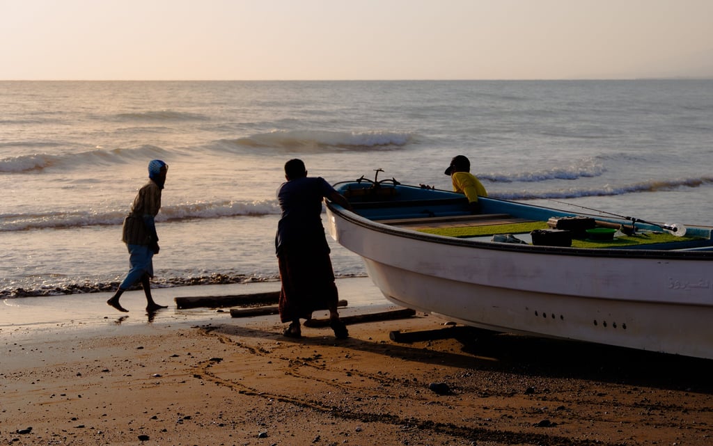 Our first stop was Quriyat beach to catch the sunrise. The main attraction here would be the fisherman readying their boats and mending nets, although to begin with, we were curious about the procession of people walking along the beach to the rocks at the end.