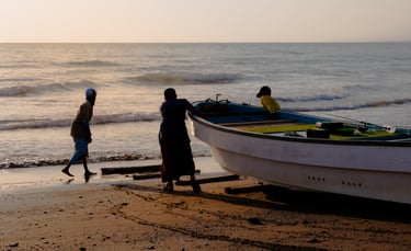 It seemed we had got up much earller than the fisherman, so the beach was pretty quiet as the sun rose. Nevertheless we caught some people mending nets and launching their boats.